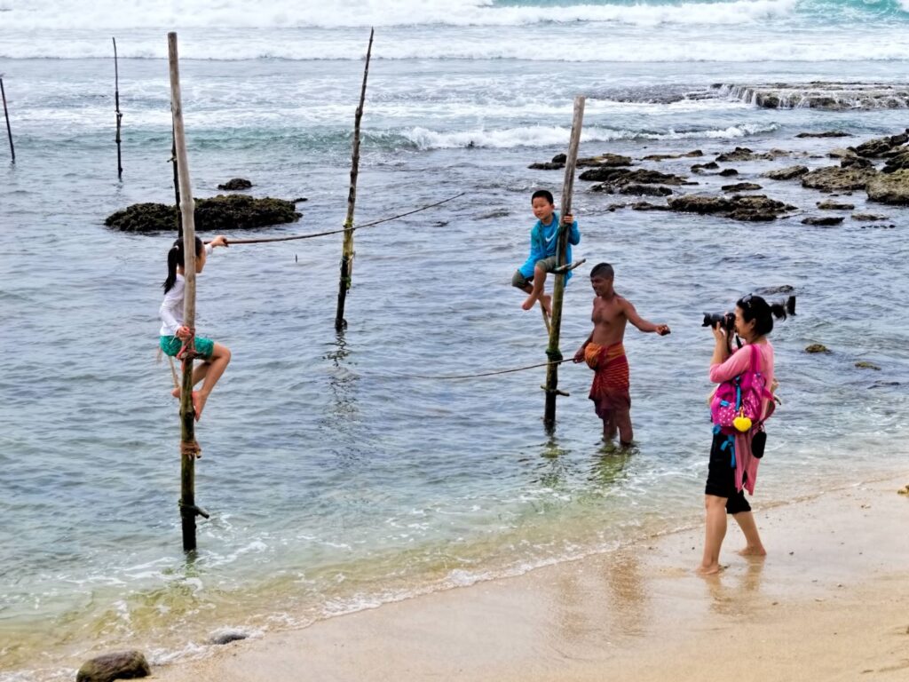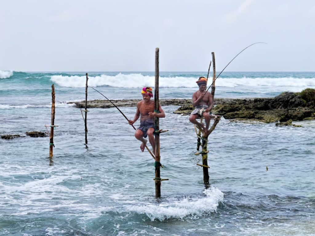 Stilt fishing, locally known as ritipanna, is one of Sri Lanka’s most iconic cultural practices. Fishermen balance on wooden poles planted in shallow waters, skillfully casting their lines to catch small fish such as spotted herrings and mackerel. This tradition, believed to have begun during World War II when food shortages forced innovative fishing methods, has since become a living heritage of the southern coast.