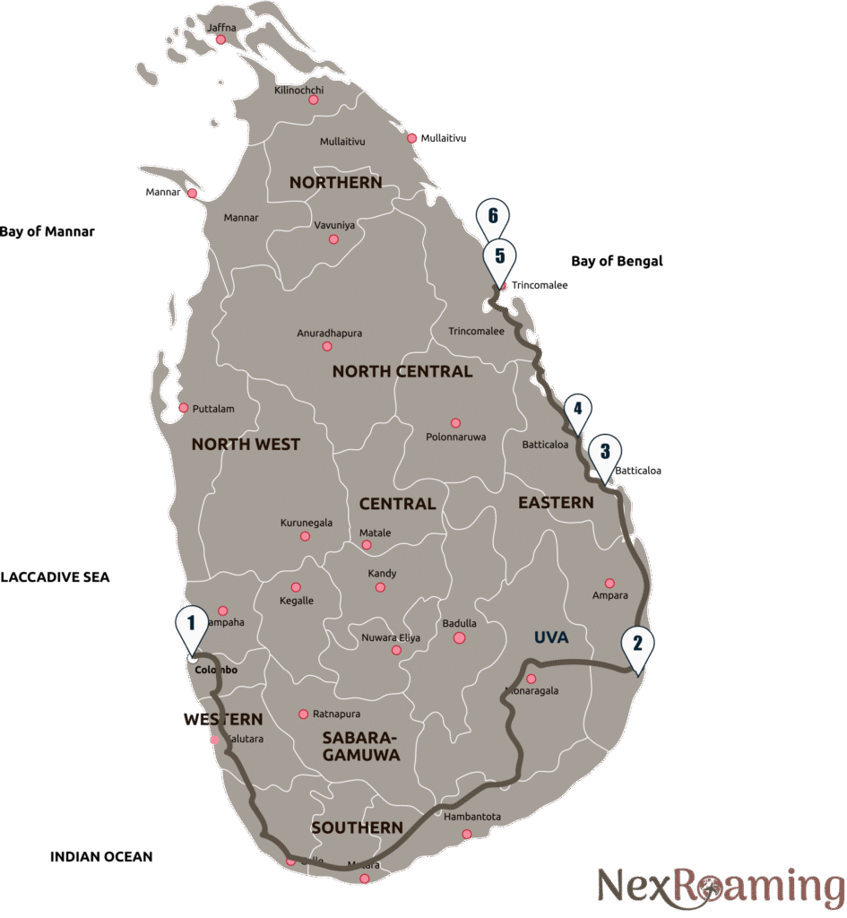 Finally, the loop ends in Trincomalee, where sacred temples meet turquoise seas. Here, you’ll explore coral reefs at Pigeon Island National Park, spot turtles gliding below the surface, and climb up to Koneswaram Temple, a sacred site perched high above the waves. Every stop adds its own color: the lively surf shacks of Arugam Bay, the cultural markets of Batticaloa, the luxury calm of Passekudah, and the soulful spirituality of Trinco.