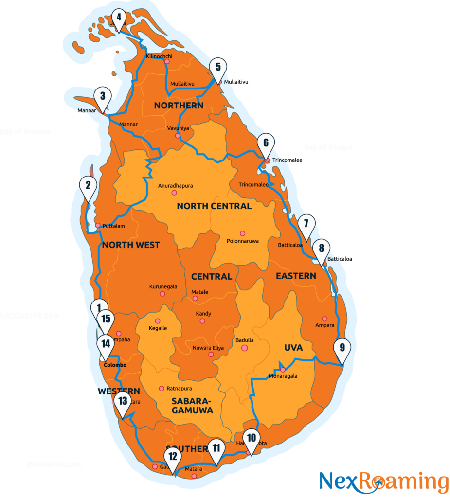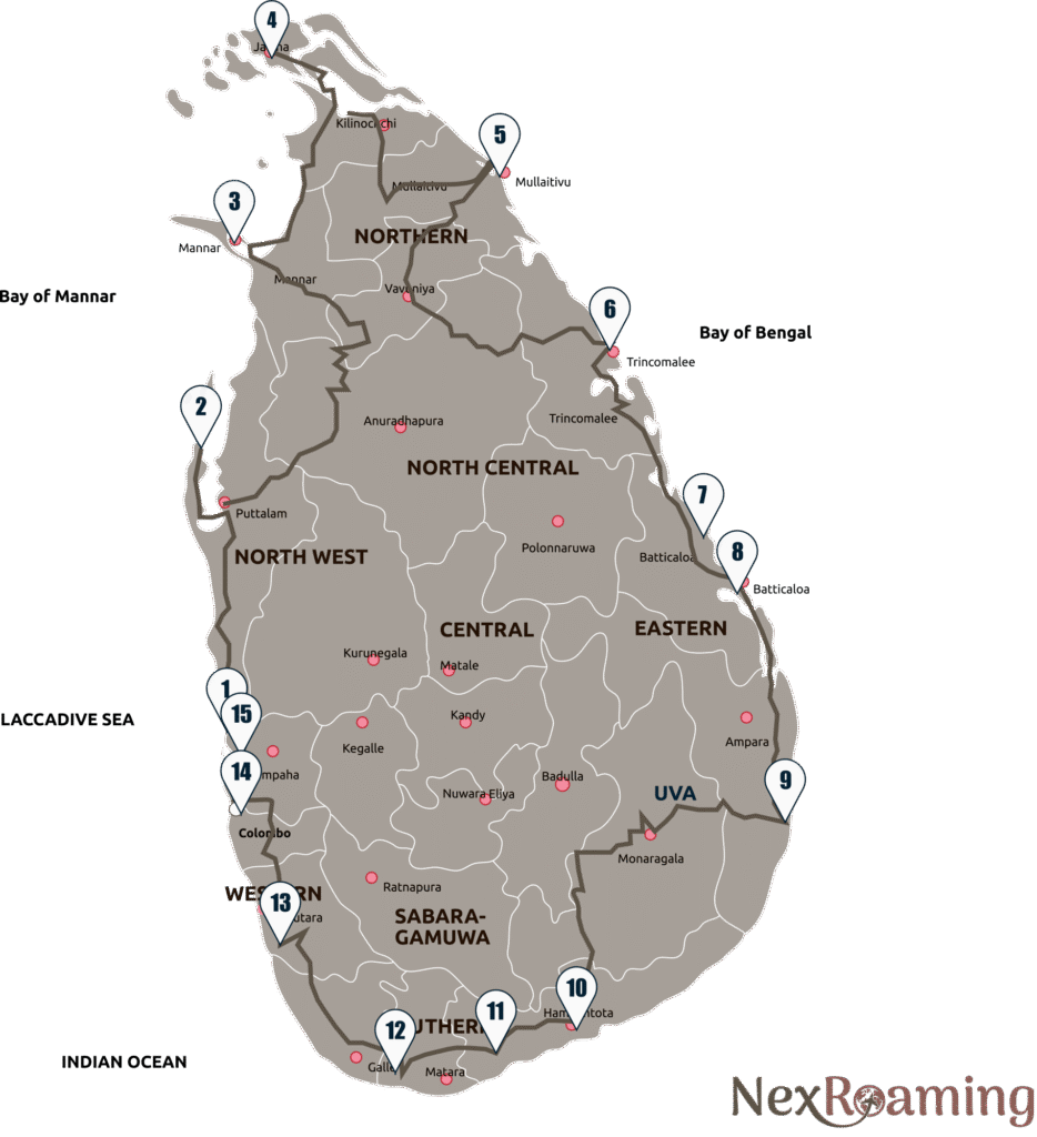 Embark on a breathtaking journey along Sri Lanka’s entire coastline with this 14-Day Coastal Tour 360, a perfect blend of cultural exploration, nature, and seaside adventure. Begin your journey in Negombo, strolling along sandy beaches and visiting local fishing villages before heading northwest to Kalpitiya, where you can explore serene lagoons, charming coastal villages, and spot dolphins or try kite surfing.